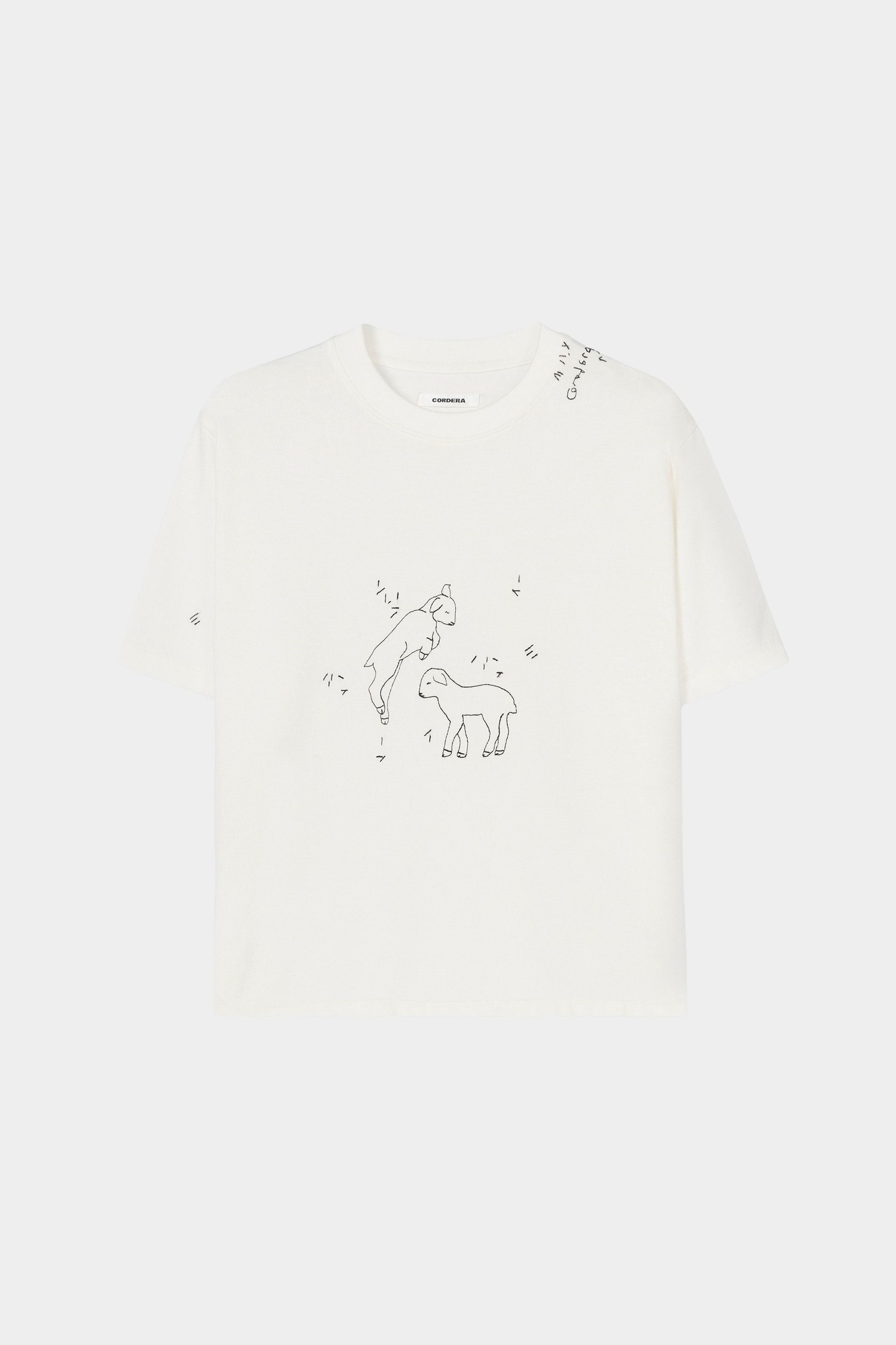 White cotton t-shirt with embroidered lamb illustration and fine line detailing on front