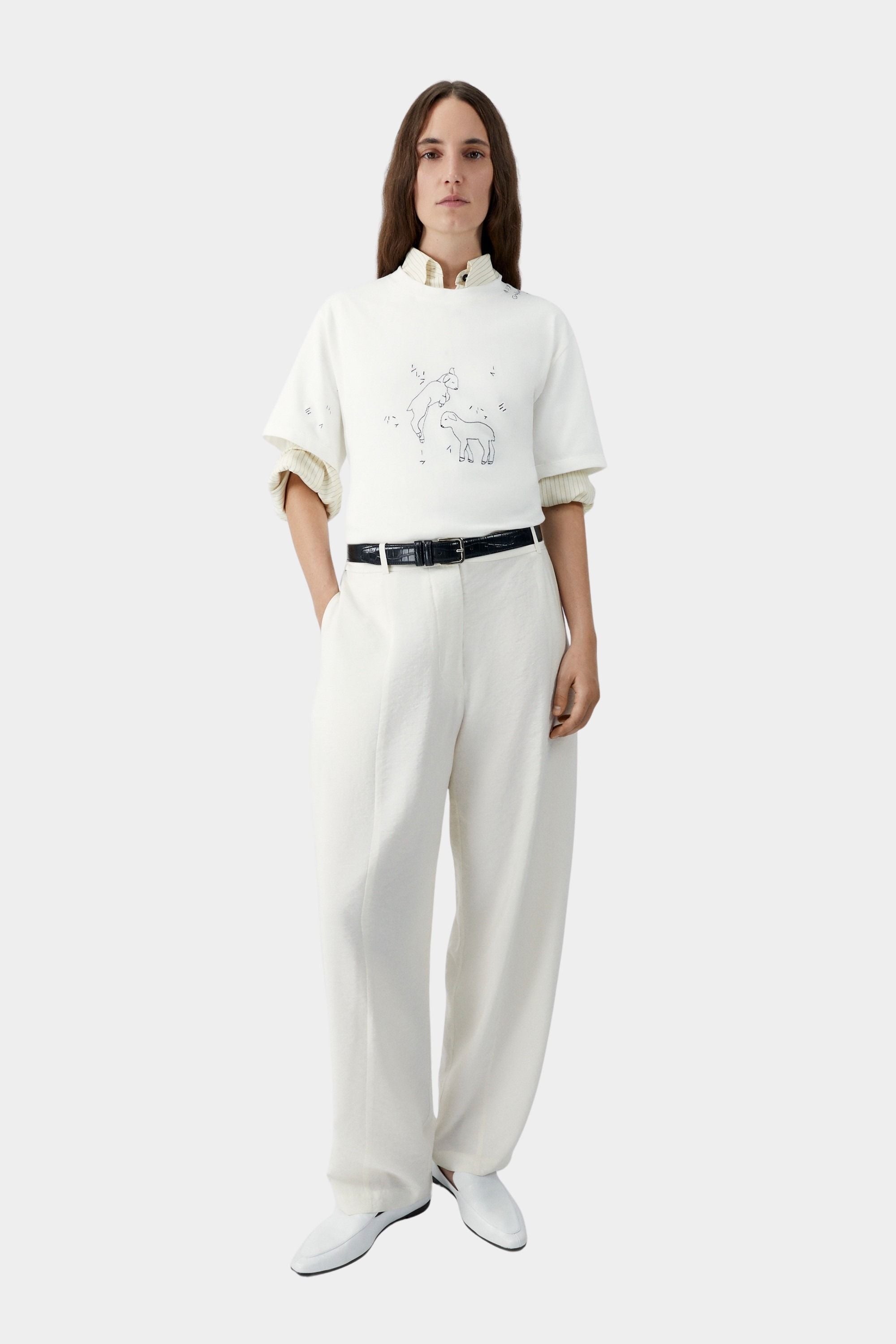 White graphic t-shirt with embroidered lamb motif, layered over shirt and worn with tailored pants
