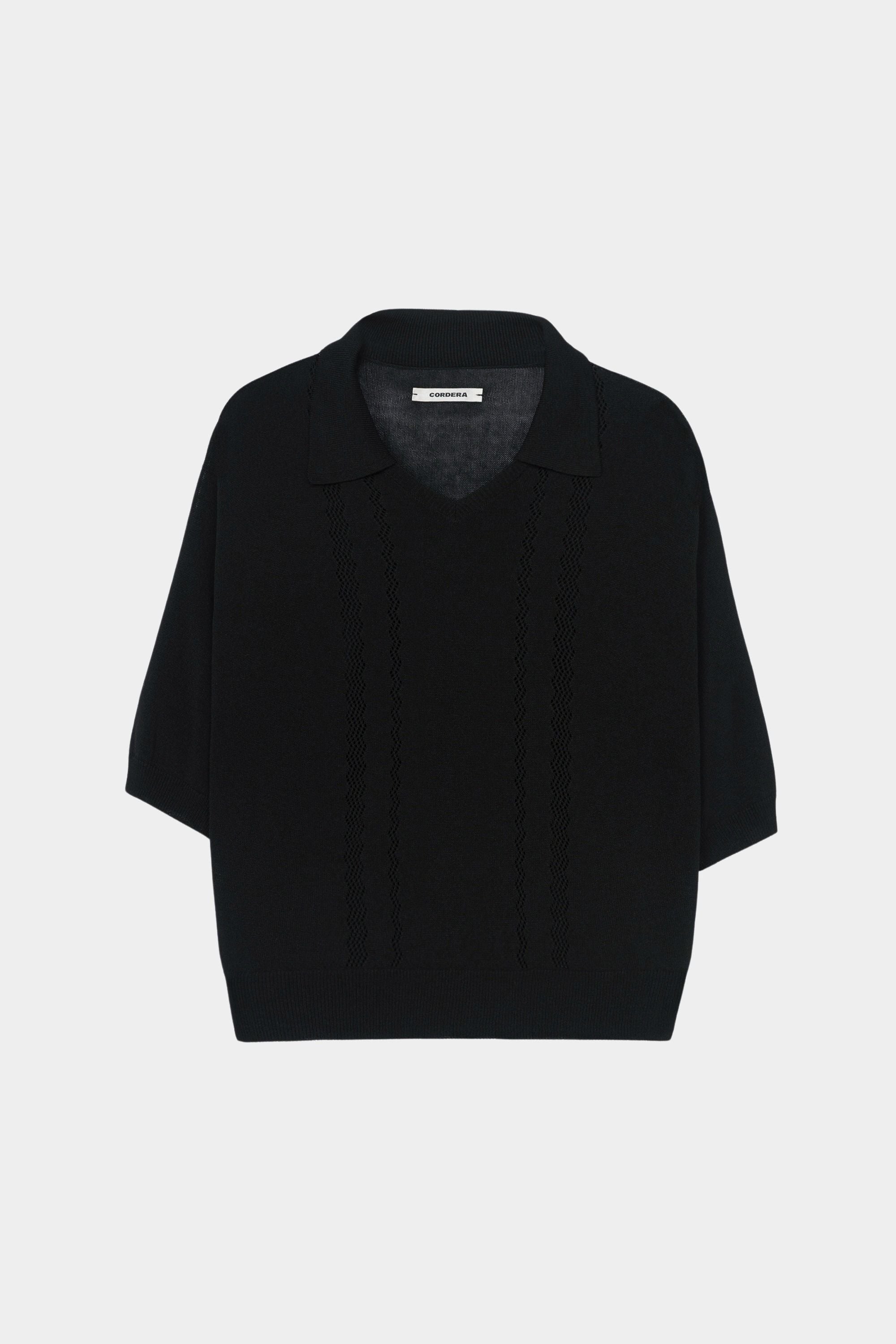 A lightweight knit polo cut in a relaxed regular fit with airy texture. Designed with a soft V neckline and classic polo collar, the front features delicate openwork knit panels arranged in two vertical bands for subtle structure. The ribbed hem finishes the silhouette at the waist, creating an easy breathable knit that pairs effortlessly with trousers, skirts, or denim.