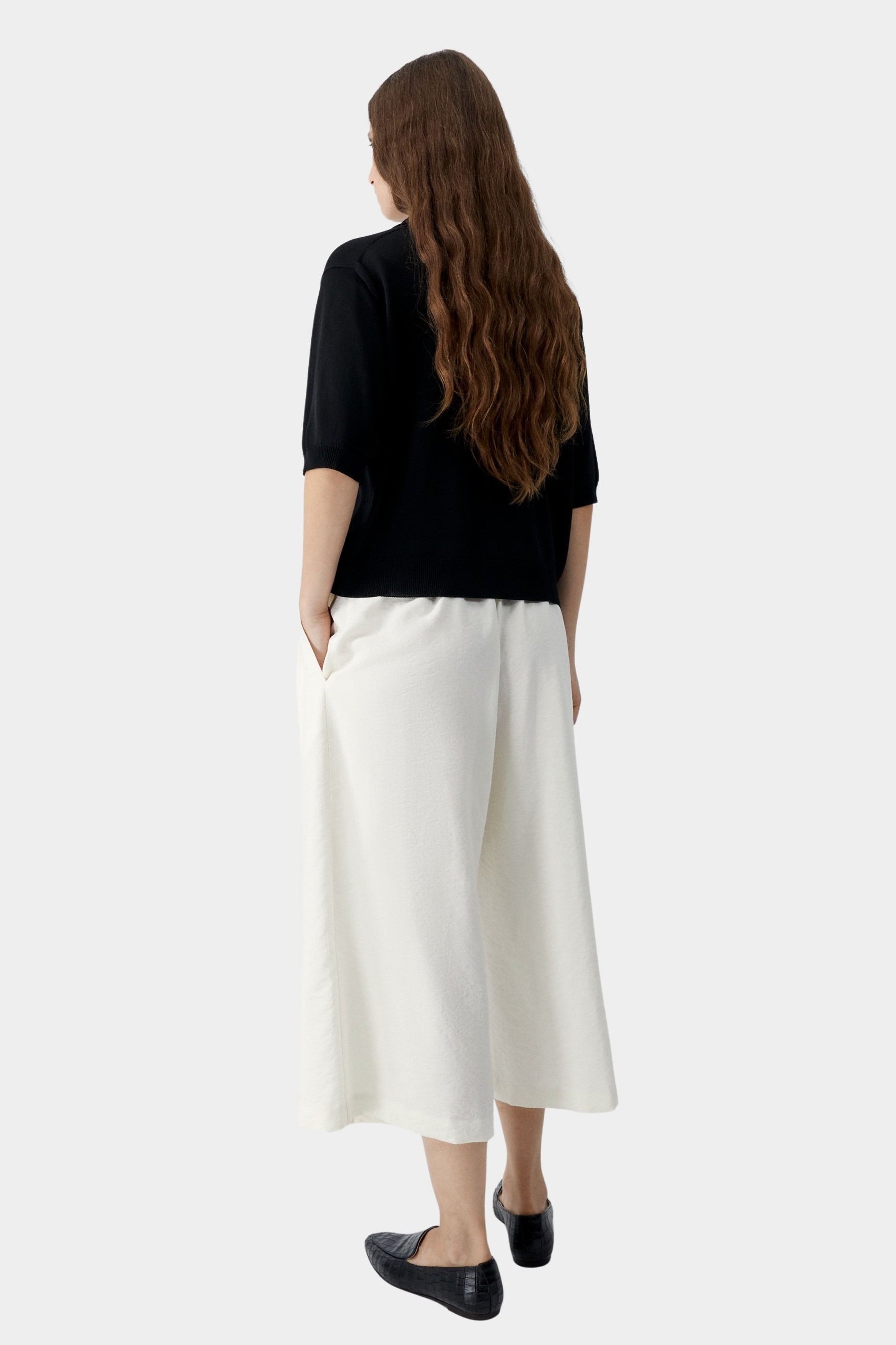 Black lace panel polo top worn with white wide leg trousers and black flats
