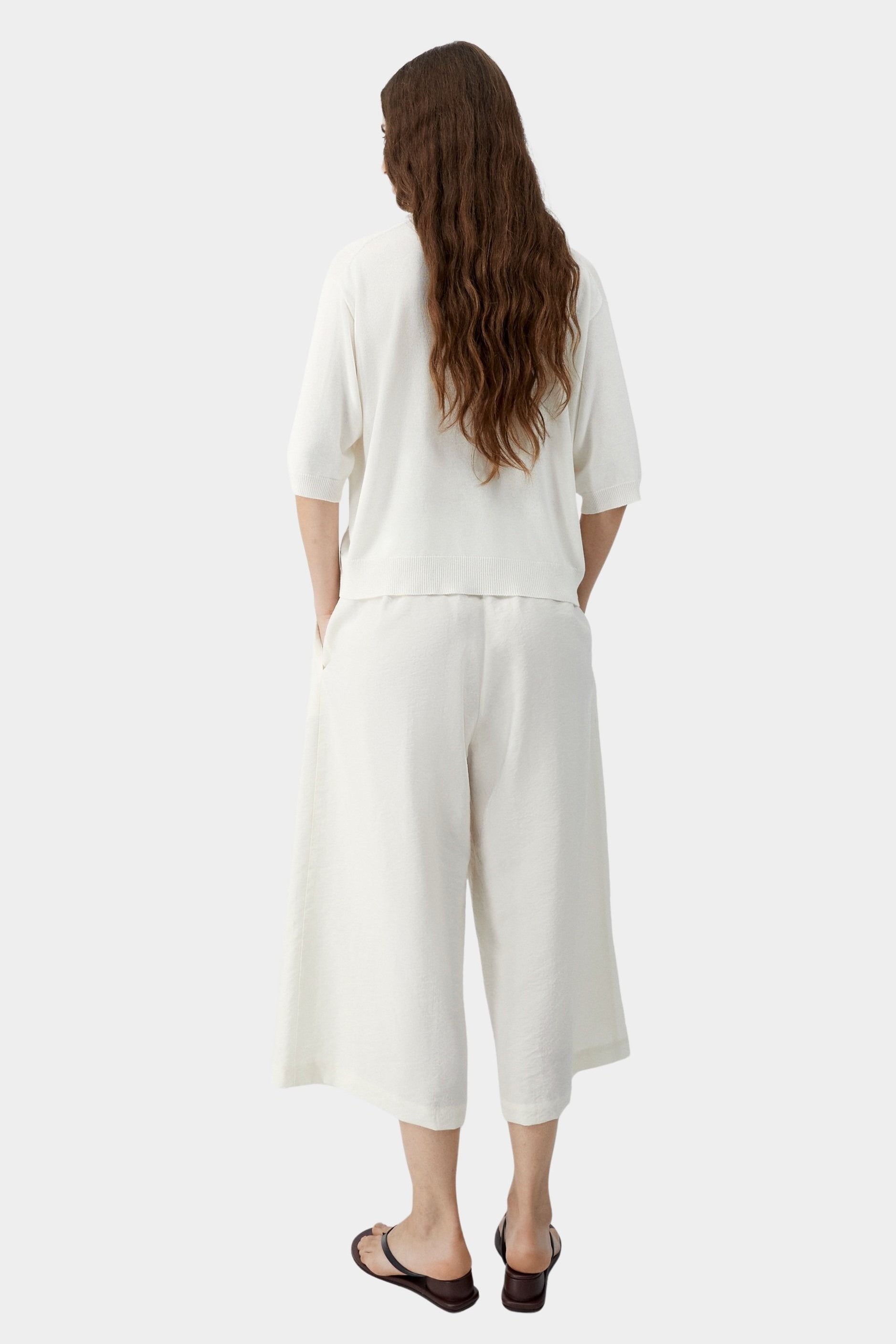 Cream lace panel polo top worn with matching wide leg cropped trousers and sandals