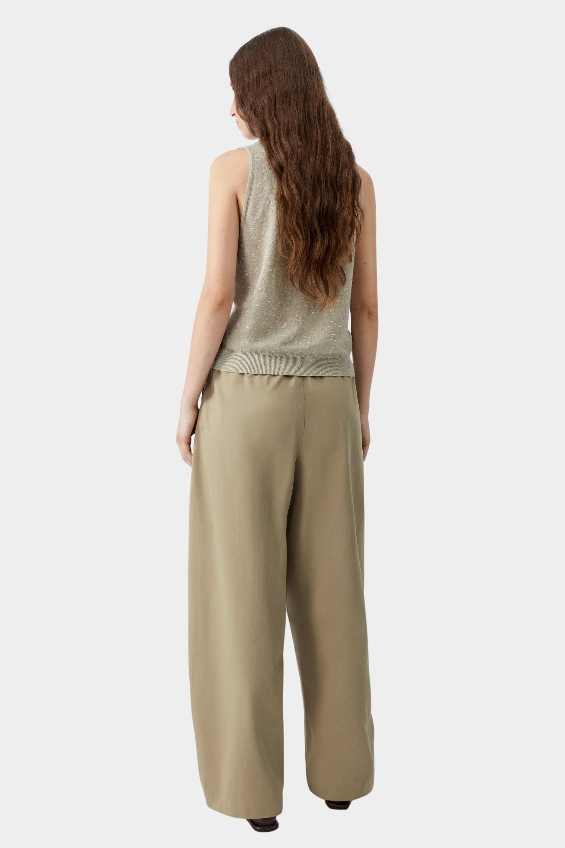 Beige flecked knit tank top worn with tailored trousers and sandals