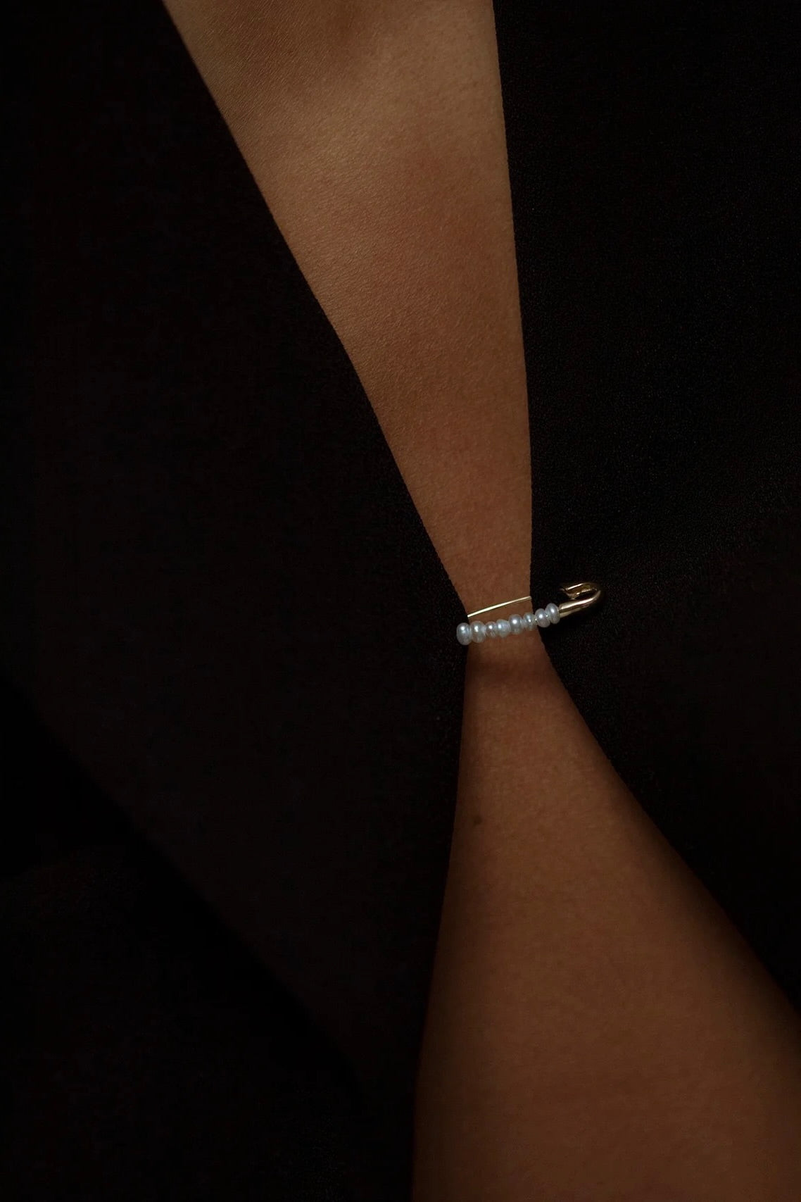 A refined take on the classic safety pin, handcrafted in recycled 14K yellow gold and finished with delicate freshwater seed pearls. Subtle yet expressive, it offers a quietly personal statement meant to be worn solo or shared.