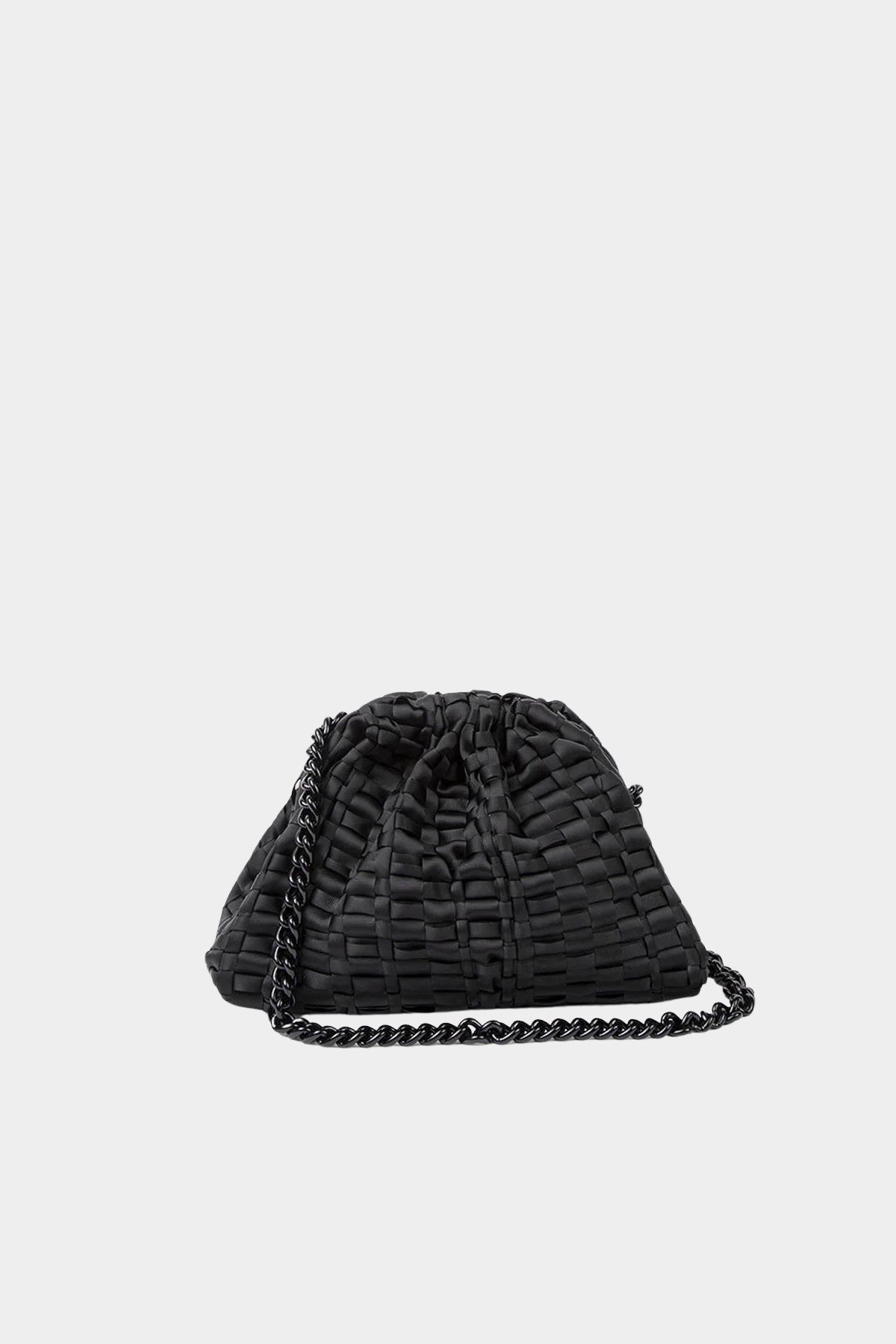 Mini Game handbag in Black. Small women's clutch in woven ribbon fabric, handmade on ancient looms. Perfect for all seasons and roomy enough to carry the essentials with you. Equipped with a ton sur ton chain to wear it over the shoulder.