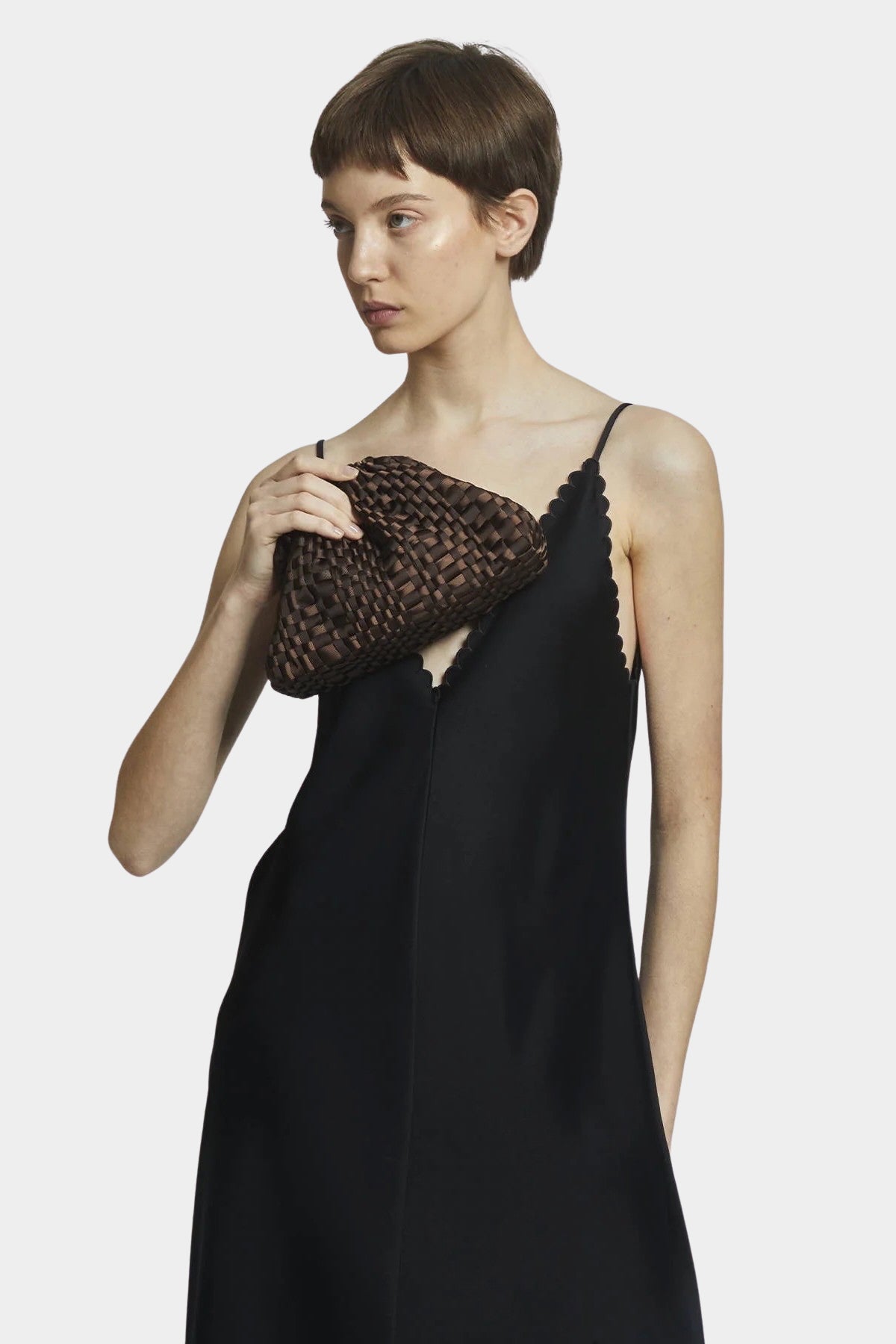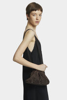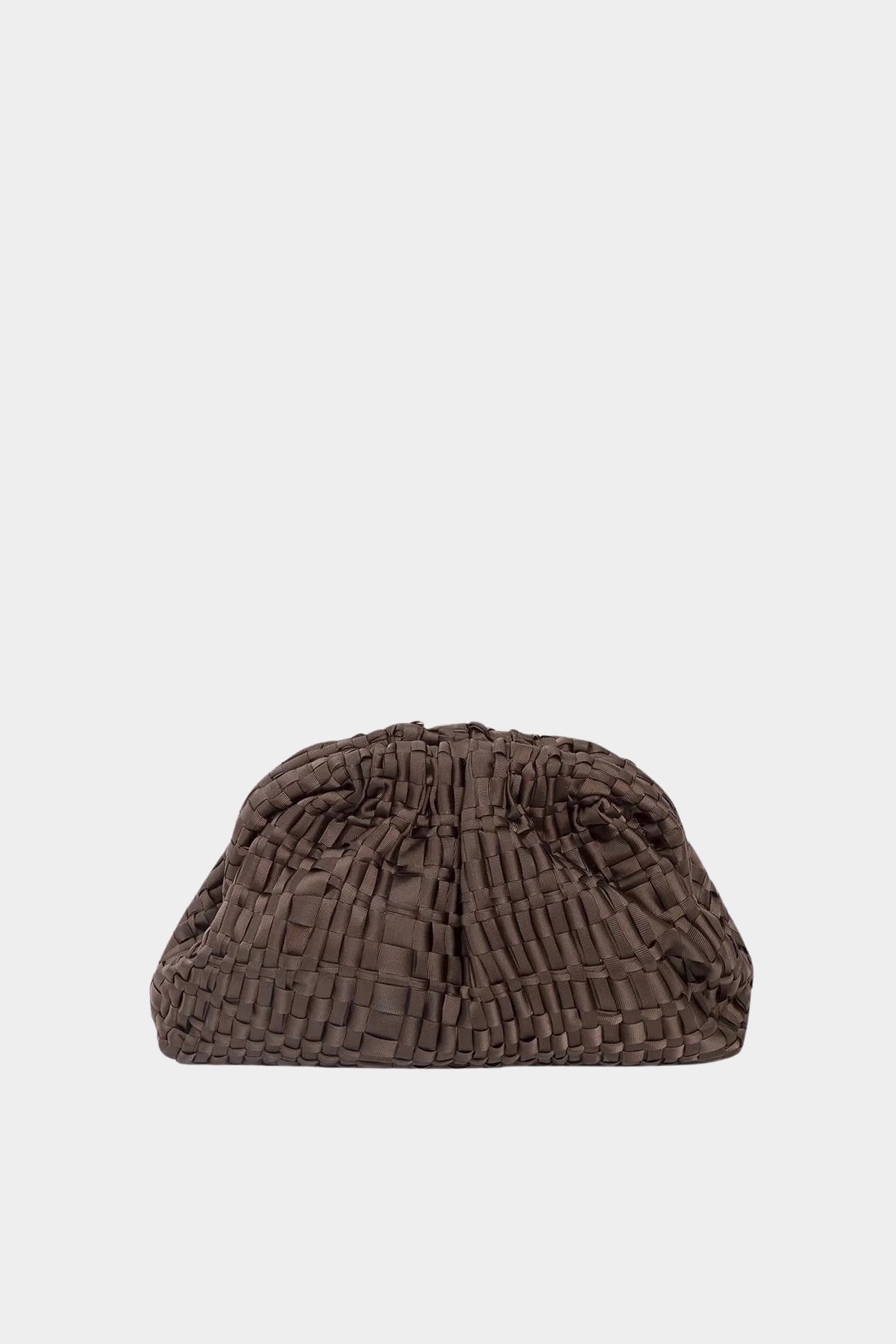 Mini Game handbag in Dark Brown. Small women's clutch in woven ribbon fabric, handmade on ancient looms. Perfect for all seasons and roomy enough to carry the essentials with you. Equipped with a ton sur ton chain to wear it over the shoulder.